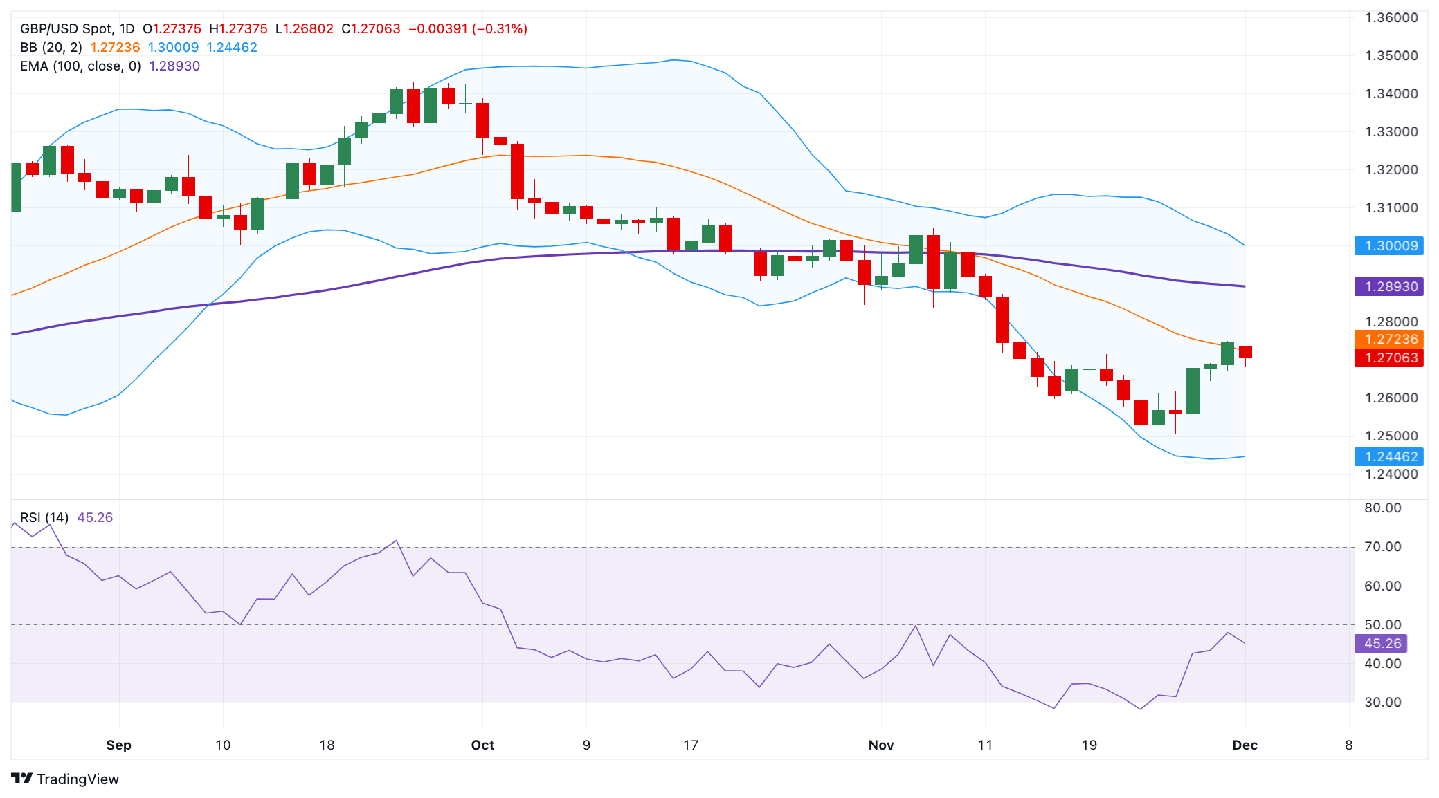 從技術(shù)上看,對英鎊/美元的負(fù)面觀點占上風(fēng),在日線圖上,價格持于關(guān)鍵的 100 日指數(shù)移動平均線(EMA)下方。14 天相對強弱指數(shù)(RSI)位于 44.40 附近的中線下方,增強了英鎊/美元的下跌動能。